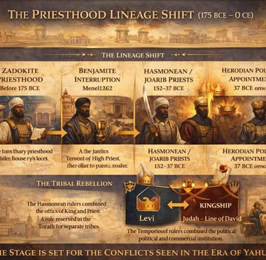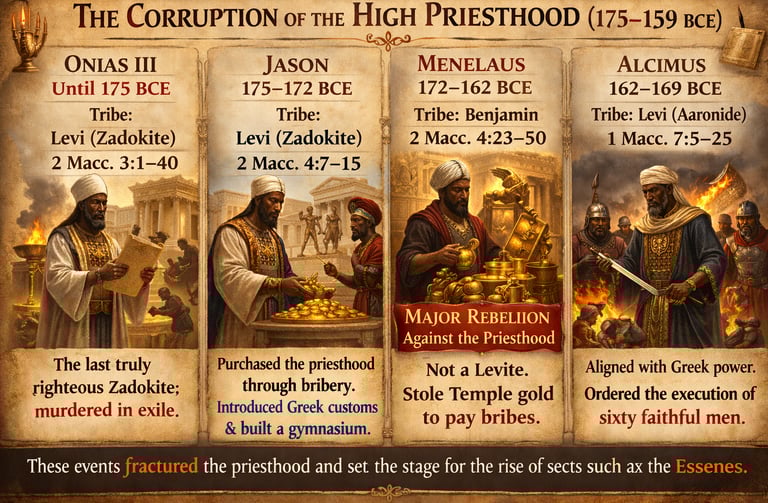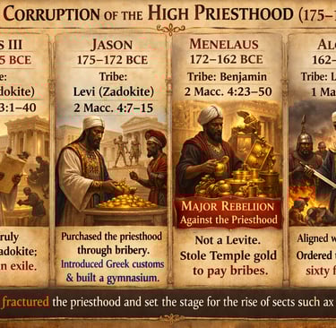 The Lineage Shift: The priesthood moved from Zadokite (pre-175 BCE) → Benjamite (Menelaus) →Hasmonean/Joarib (152 BCE) → Political Appointees (37 BCE onwards).